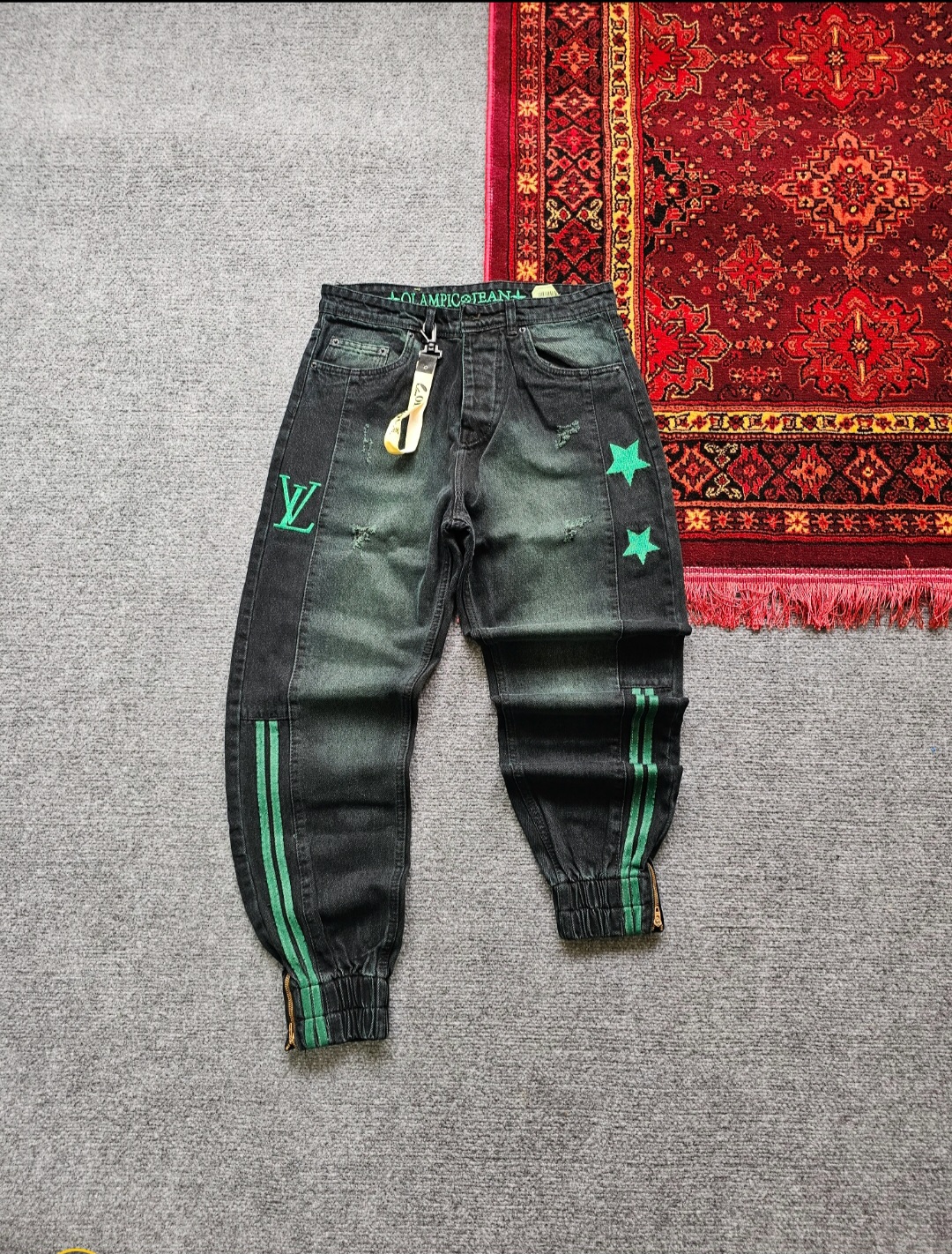 شلوار لی دو ستاره رنگ ذغالی خط سبز
