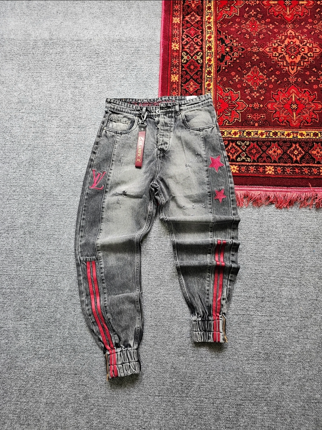 شلوار لی دو ستاره رنگ ذغالی خط قرمز