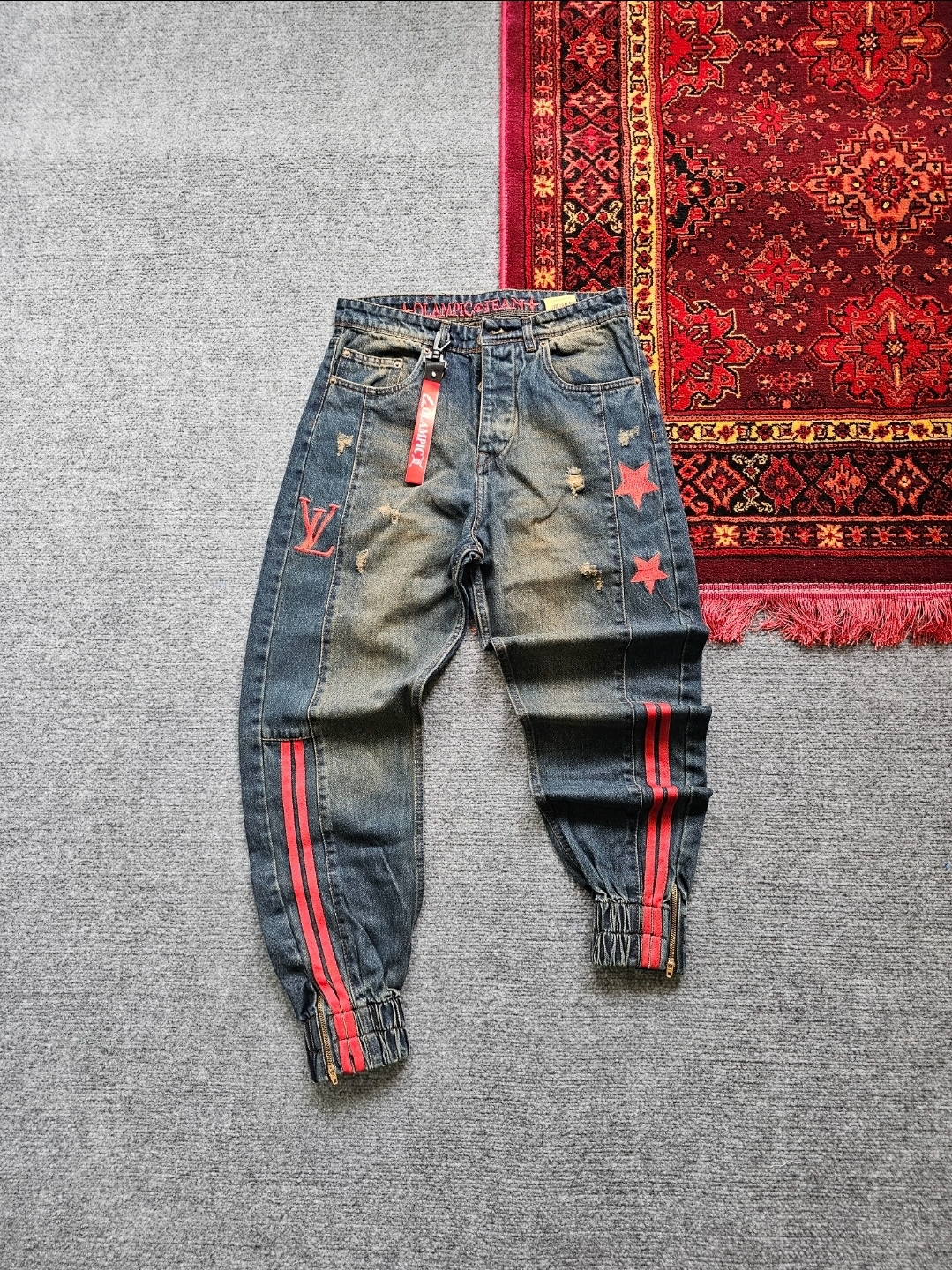 شلوار لی دو ستاره رنگ ابی کثیف خط قرمز