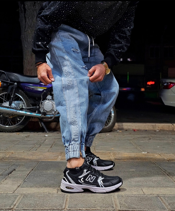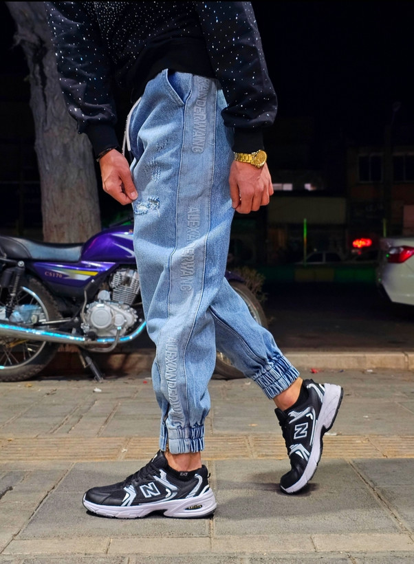 شلوار مام اسلش کمرش کش دمپا کش زیپ بغل نوار رنگ ابی